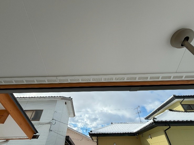 このスリット状のものは「軒先換気」のための部材になります。そしてこの「軒先換気」部材は、小屋裏を換気するために重要なものになっています。小屋裏は普段生活しているとあまり意識をしていない場所ですが、屋根と天井の間の空間になります。そして「小屋裏換気」は、この屋根と天井の間にできる小屋裏空間に外の空気を取り入れて換気をすることを言います。