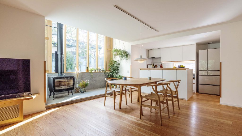 薪ストーブをリビングに設置したことで、家全体が心地よく温まり、年中裸足でいられる快適さ。