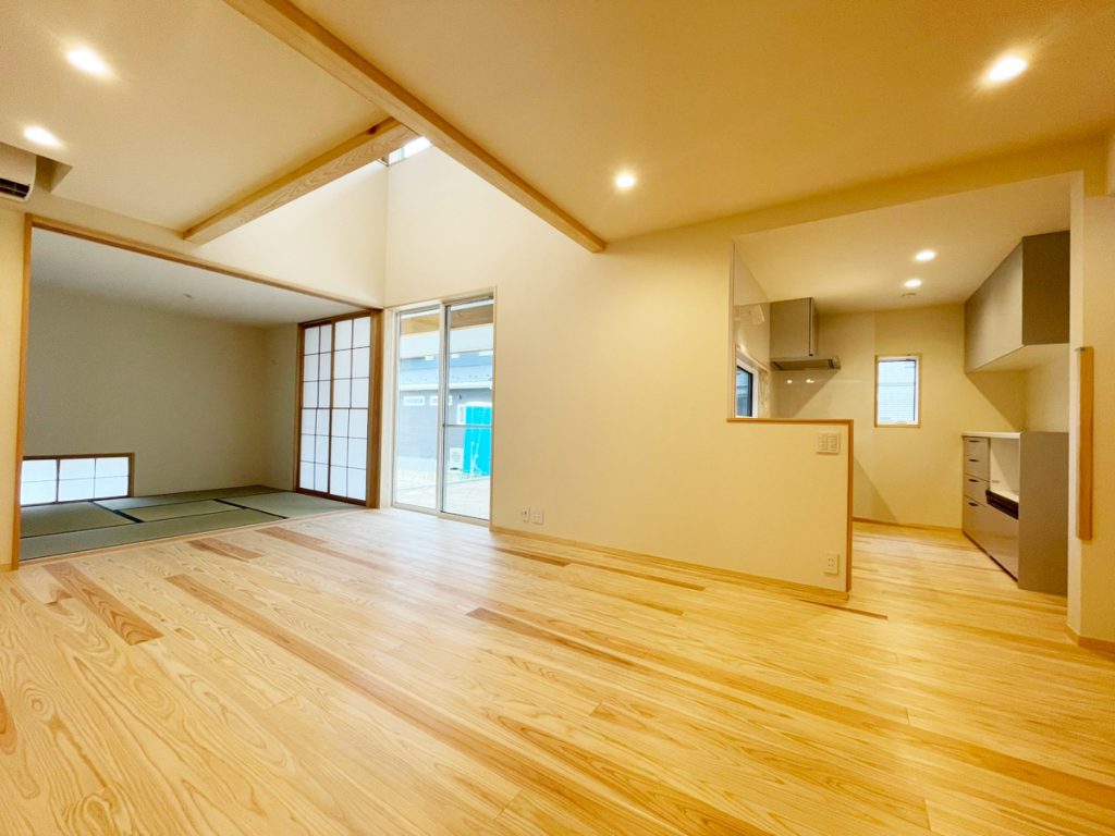 和室とリビング、そして庭への繋がりを考えた間取りで、吹き抜けの効果もありとても広々とした空間に仕上がっています。