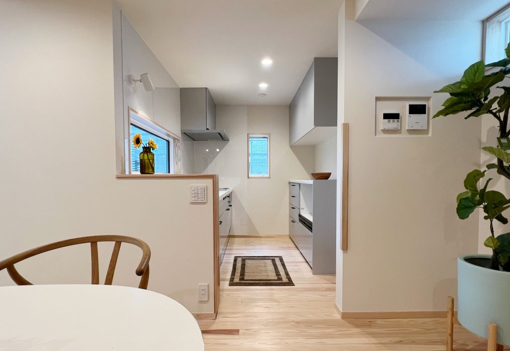キッチン設備はグレーで統一してシンプルで落ち着いた印象に。