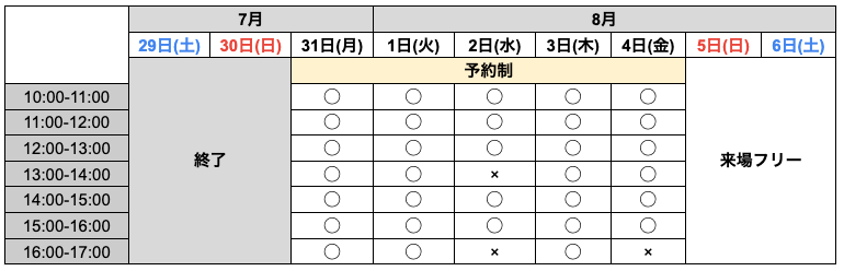7月29日・30日・8月4日・5日は予約なしのフリーでご来場いただけます。