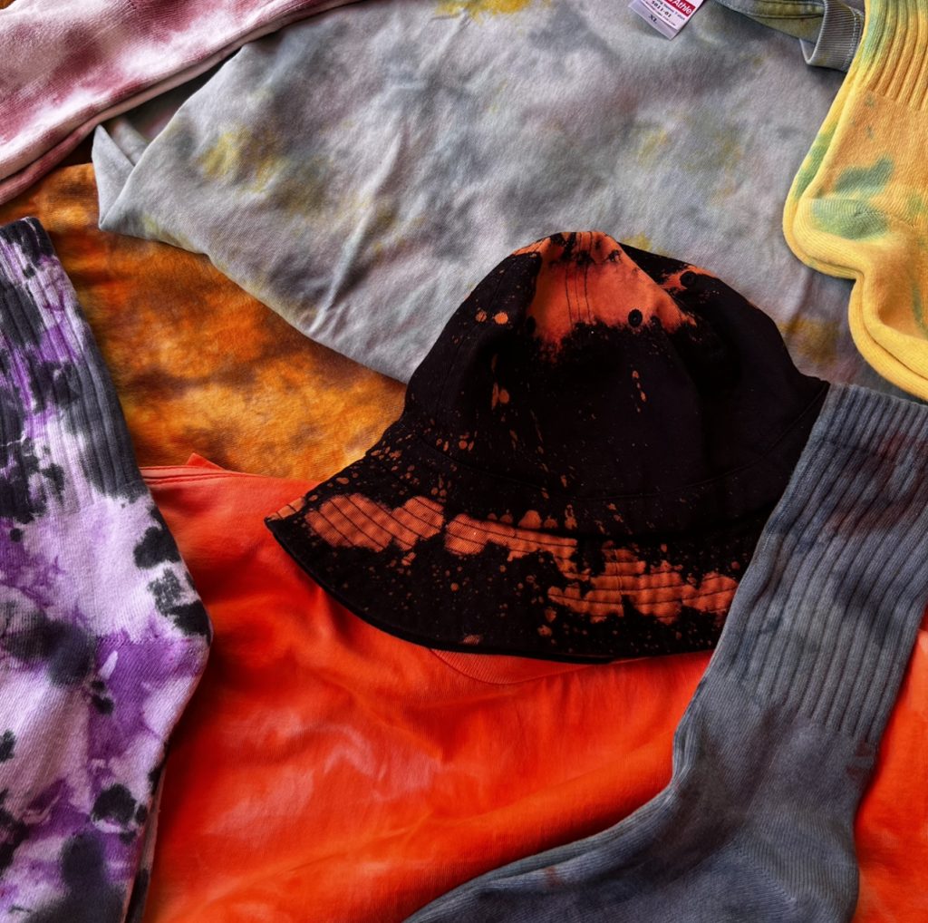 ソックスやクッションカバーのタイダイ染め体験が出来るワークショップを開催。当日販売している商品の染色はもちろん、ご家庭にあるコットン製品のTシャツやクッションカバー、エコバッグなども染色出来ます。作業時間は30分前後。この機会にぜひ!