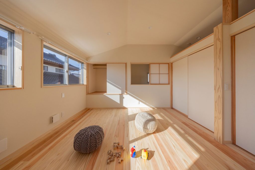 勾配天井で高さの違いも楽しい子供部屋は、建具を開けるとワンフロアののようにより広がりのある空間に。