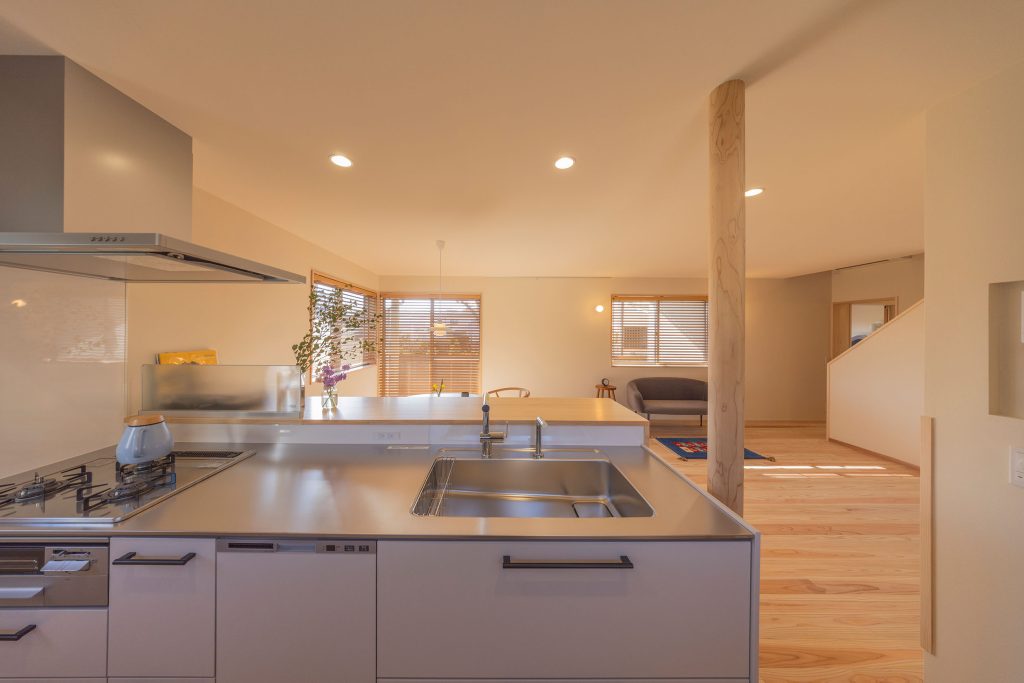 キッチンは対面式。ダイニング側に造作カウンターを付けているので広々と使用でき、ご家族とコミュニケーションとりながら、リビングで過ごす小さなお子様の様子も見ながらお料理ができます。となりの庭を眺めることのできる窓も何気ないポイント。