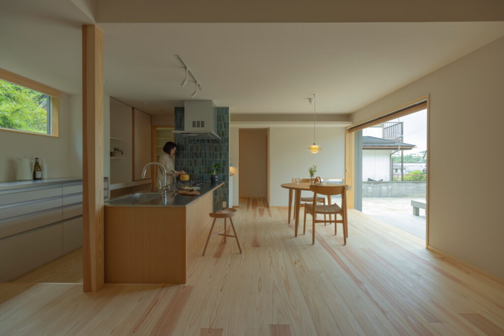 外の風景が室内に溶け込むような印象を受けます。特にリビングやダイニングスペースでは、外部のテラスと連続性を持たせることで、室内にいながらも外の自然を感じられる設計に。また、窓の配置や大きさにも工夫があり、室内全体に自然光が優しく差し込むことで、空間全体が明るく、開放感のある雰囲気を作り出しています。