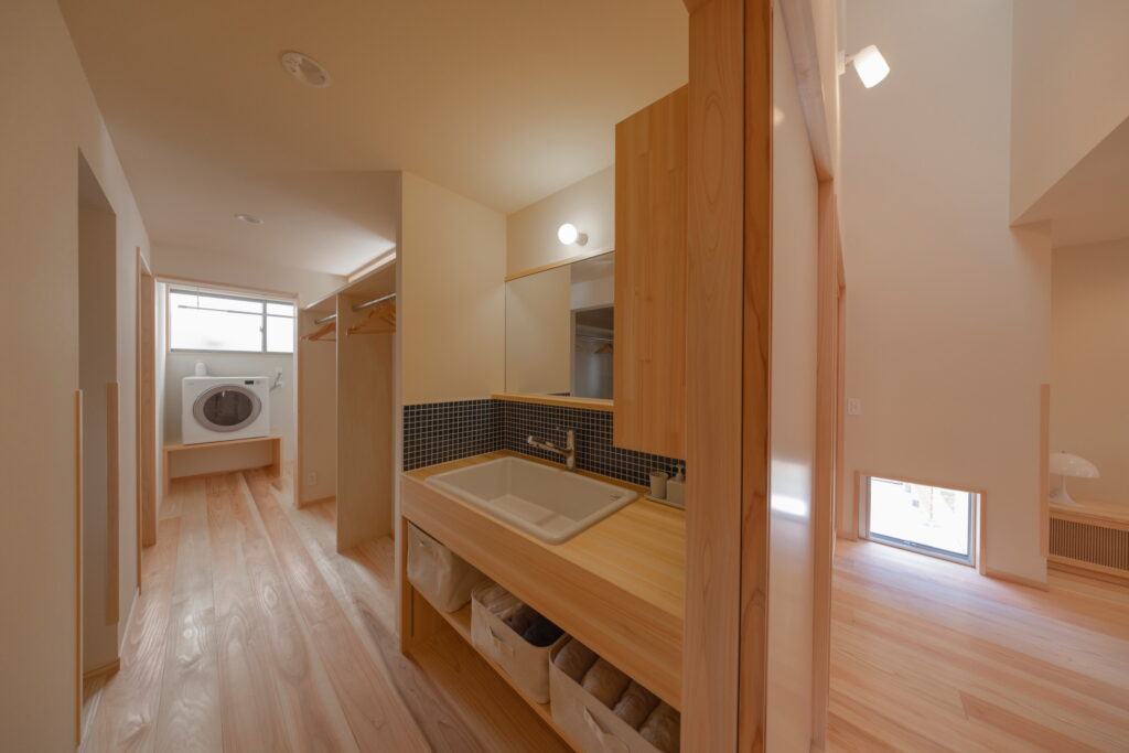 廊下には洗面やクローゼットなどの機能を組み込み、明るさを保ちながら空間を活用することで日常の動作がスムーズになる動線になっています。