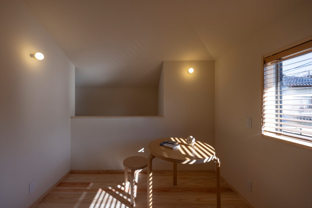 2階ホールはあえて個室にせず、用途や家族の成長に応じたレイアウトを楽しむことができます。吹き抜けとの連続性により、家全体で家族の気配を感じられ、変化を受け入れる柔軟な空間に仕上げています。