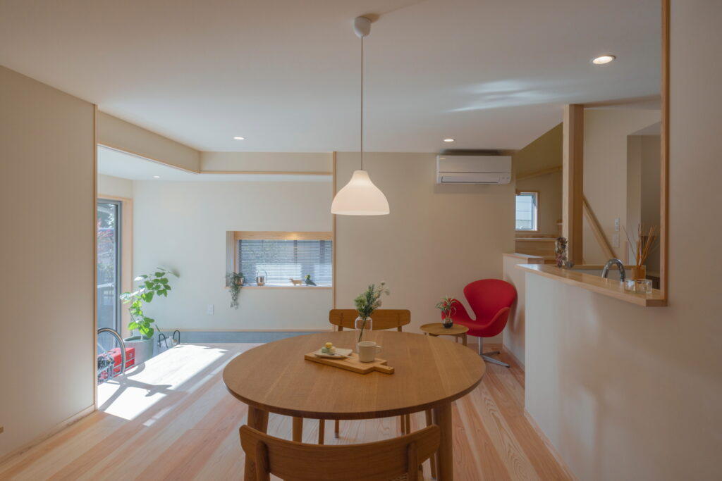 囲まれた敷地でも広がりを感じられるよう、屋外と屋内をゆるやかに繋ぐ土間。他の建物に囲まれた立地条件でも、圧迫感を感じさせない空間に仕上げたお家は日常の暮らしにおいても豊かさをもたらす場所へ。