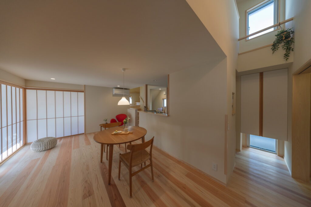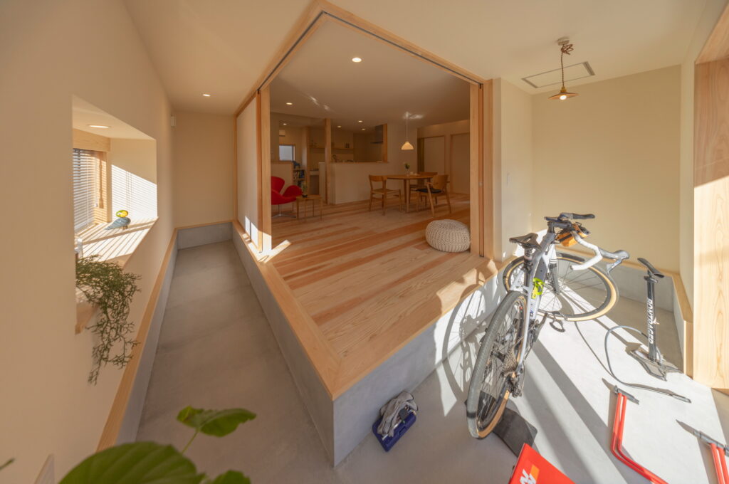 ご夫婦の趣味である自転車や観葉植物を飾る場として、リビングとの間仕切りには障子を採用し、柔らかな光を取り込みながら断熱効果も兼ね備えています。