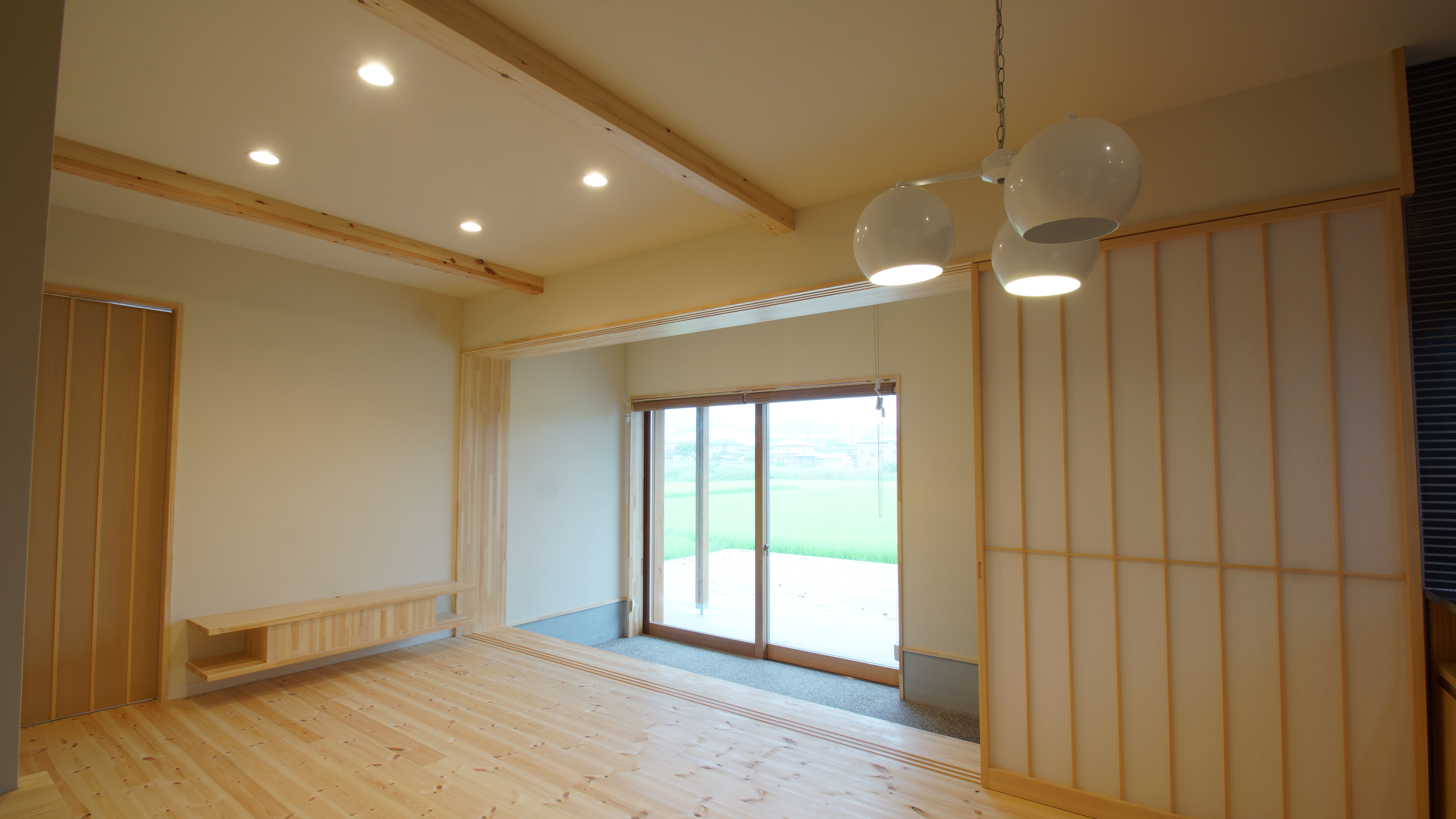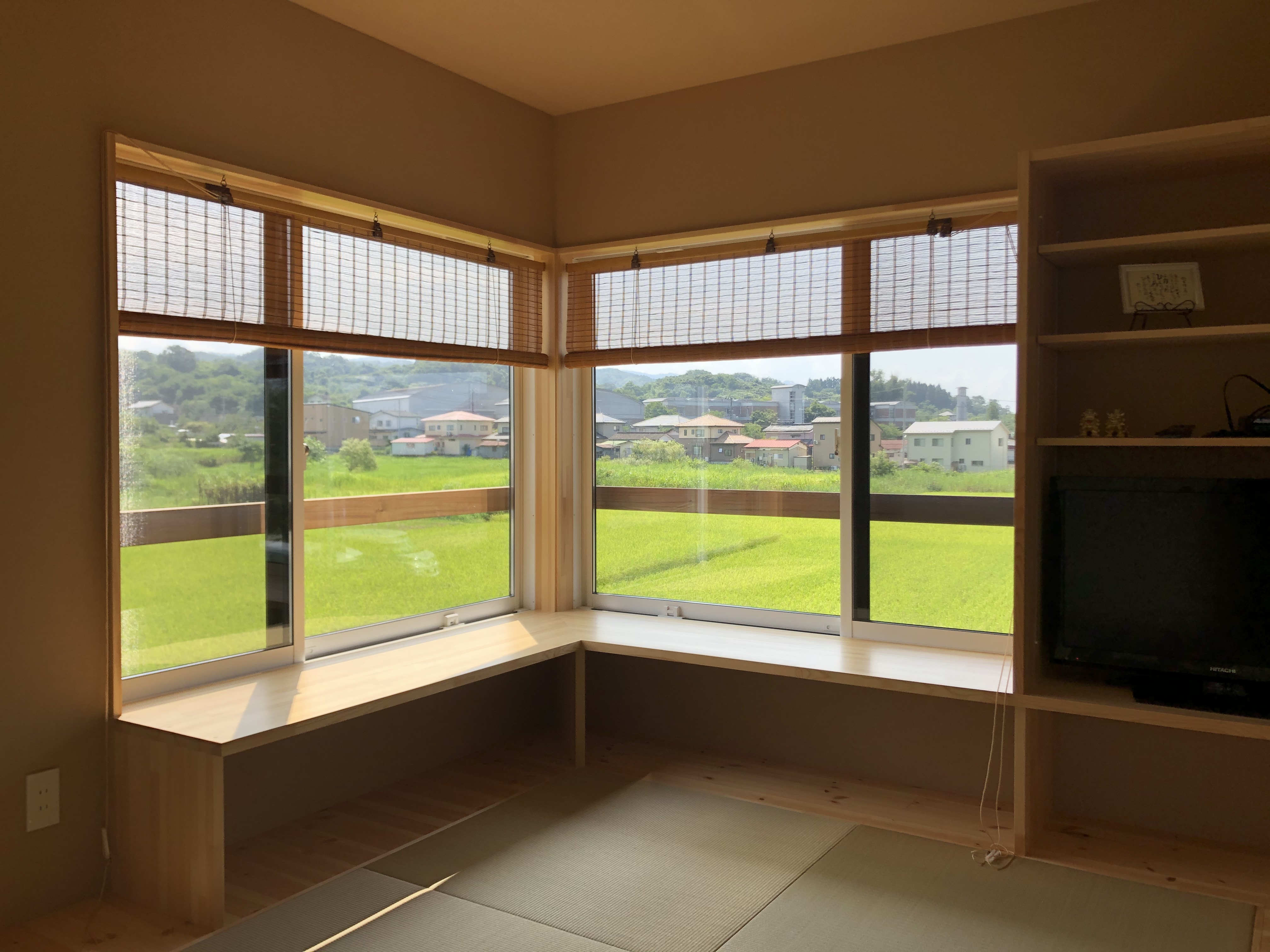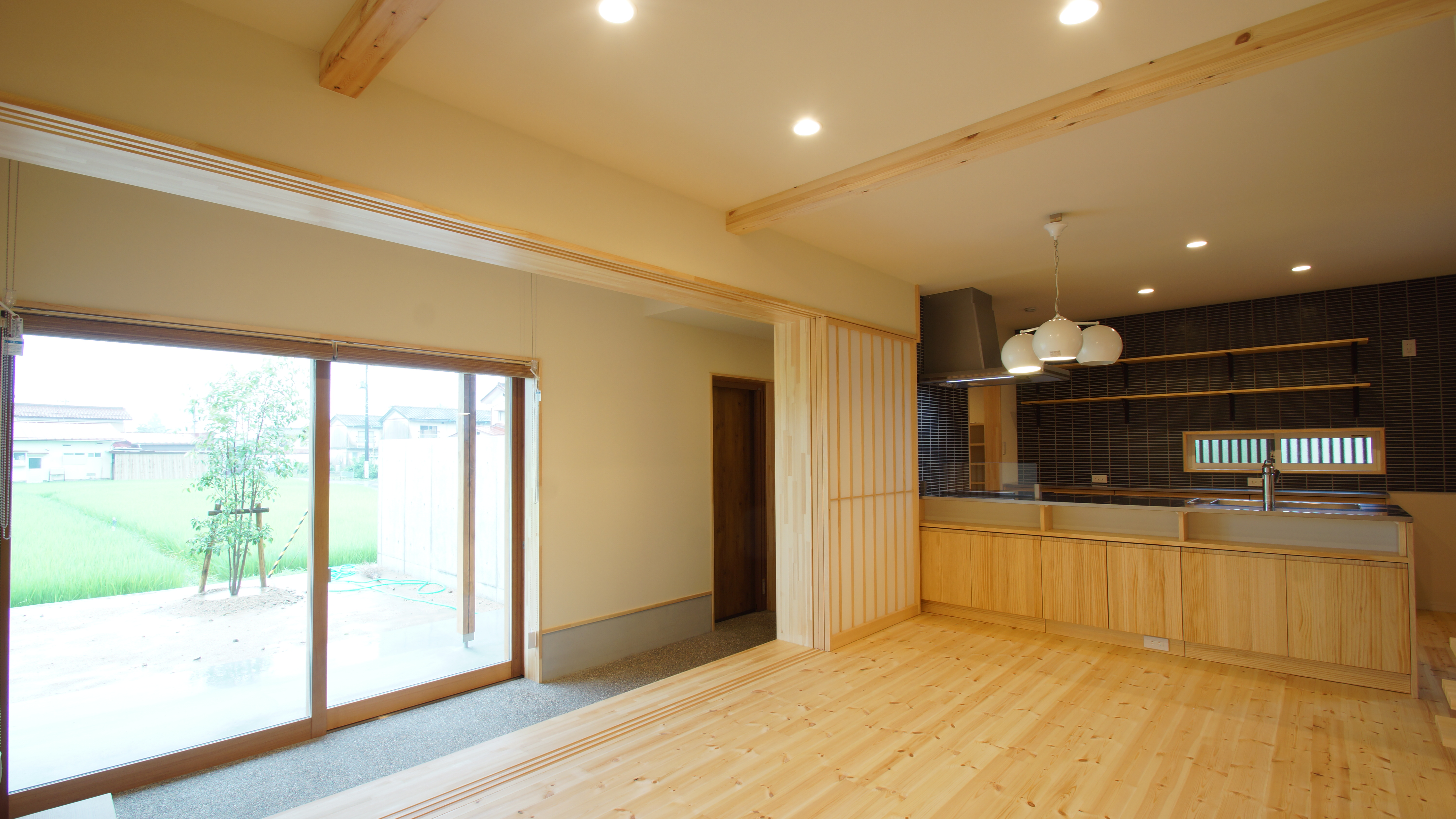 田園風景を借景にできる立地条件を生かし、南側にはフルオープンの木製サッシ、2階和室には景色と花火大会が良く見えるコーナーサッシを設けました。洗い出しの土間空間や深めの軒下などもあり、自然環境を楽しみながら過ごせる居場所がたくさんの住宅です。キッチンにはお施主様こだわりのミーレの食洗器を採用しました。