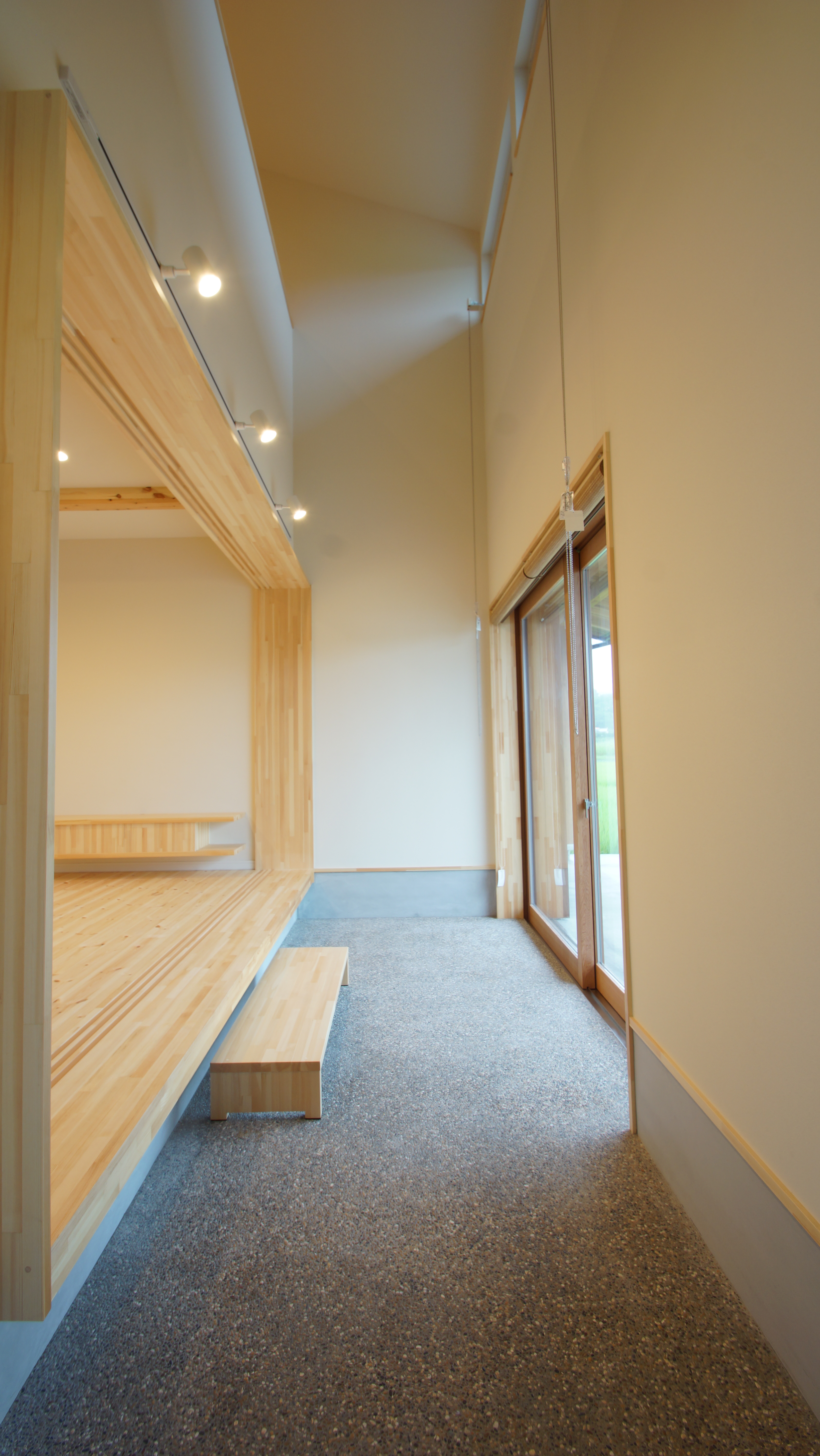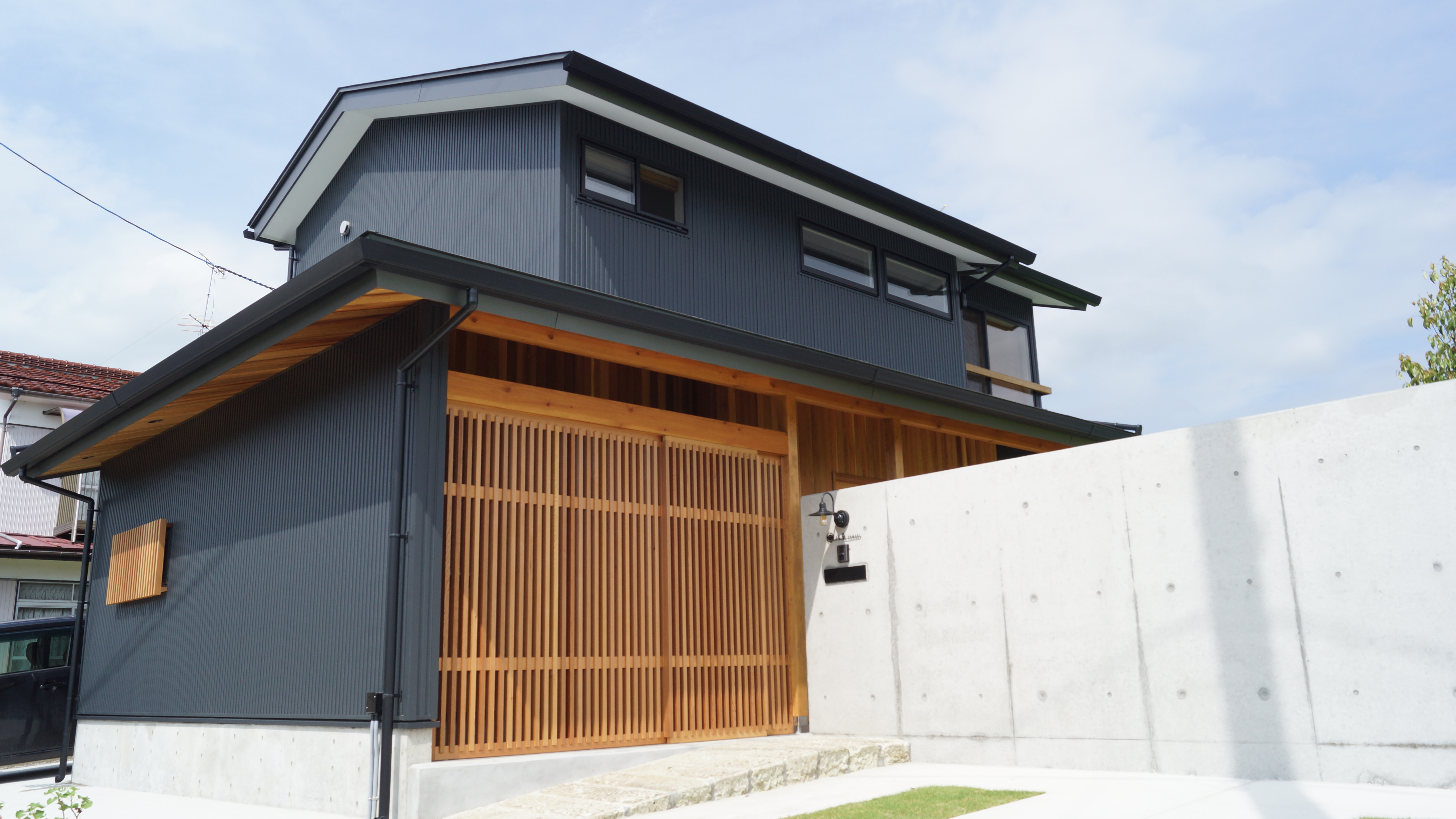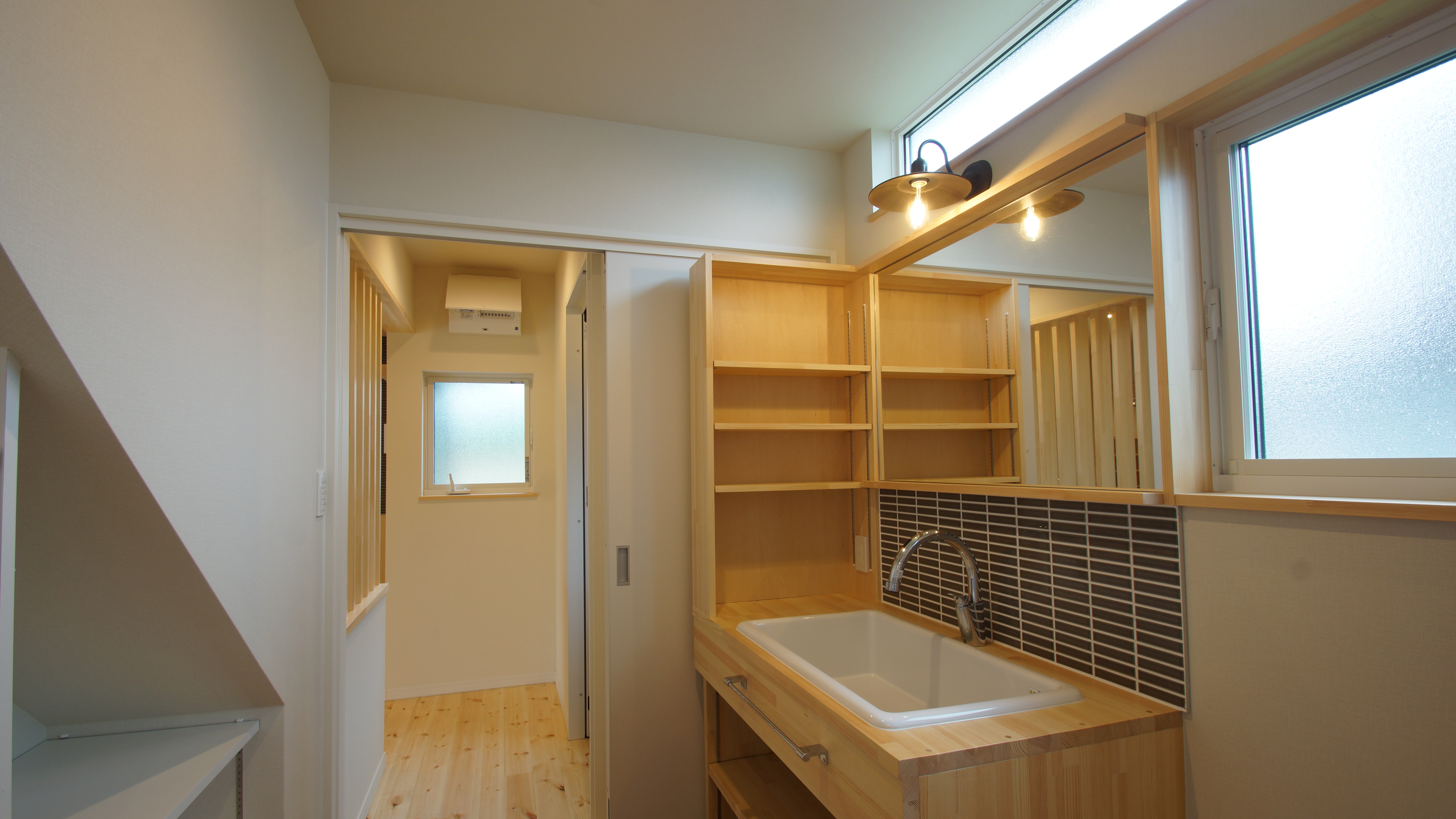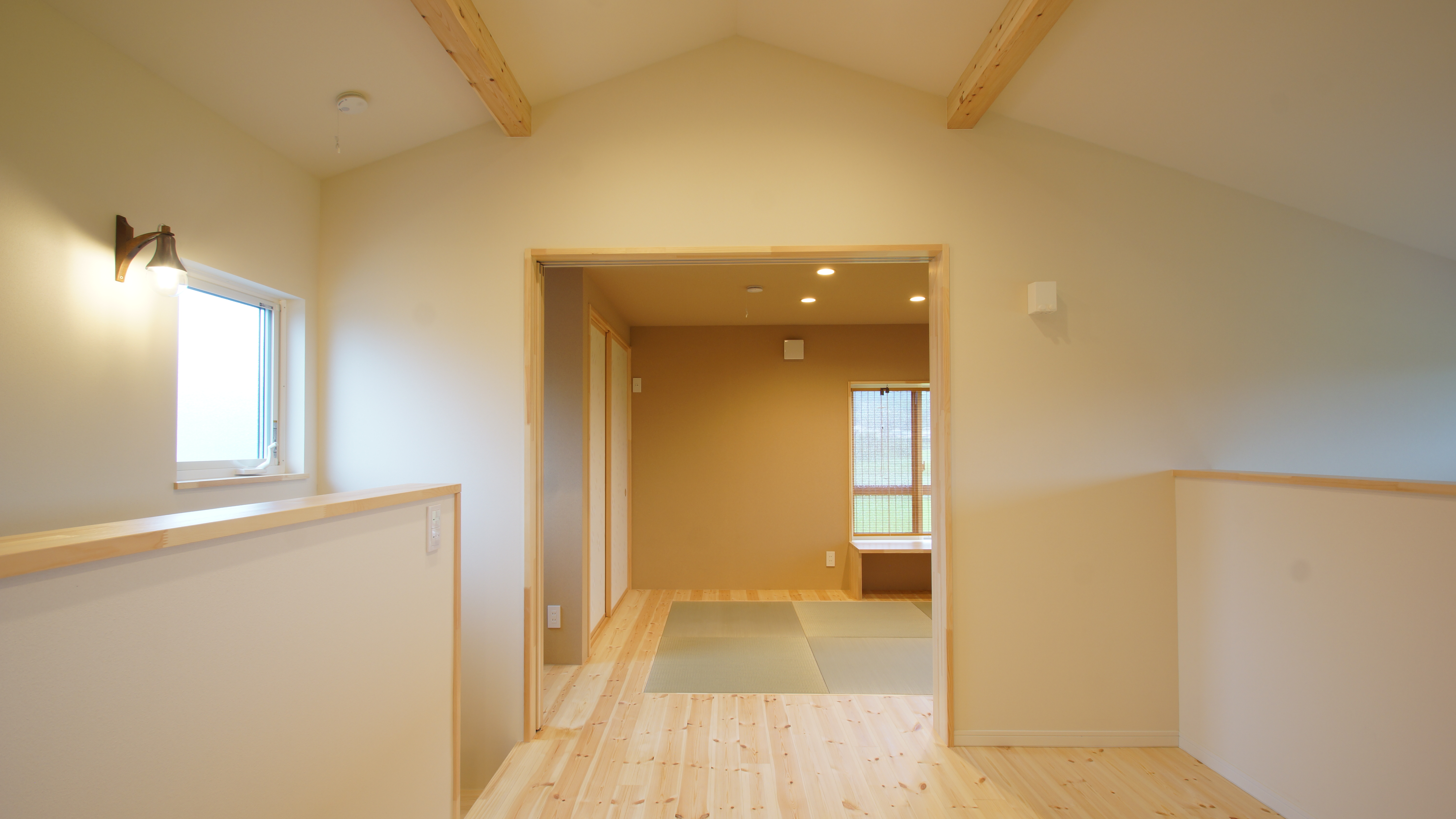 田園風景を借景にできる立地条件を生かし、南側にはフルオープンの木製サッシ、2階和室には景色と花火大会が良く見えるコーナーサッシを設けました。洗い出しの土間空間や深めの軒下などもあり、自然環境を楽しみながら過ごせる居場所がたくさんの住宅です。キッチンにはお施主様こだわりのミーレの食洗器を採用しました。
