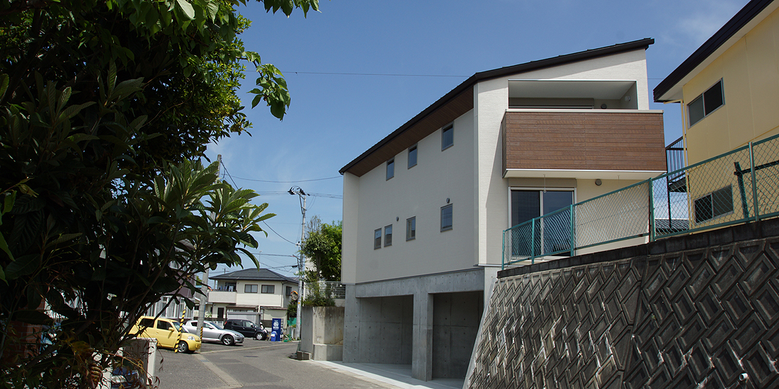 高低差のある敷地を有効に活用した住まい。 地面に埋まってしまう部分はRC構造のガレージ、その上が木造2階建ての住宅部分。 最上階は構造体を表わしたゆとりある広さのLDK。眺望が良いうえにプライバシーも確保でき、のんびりくつろげる家族だんらんの場となっています。