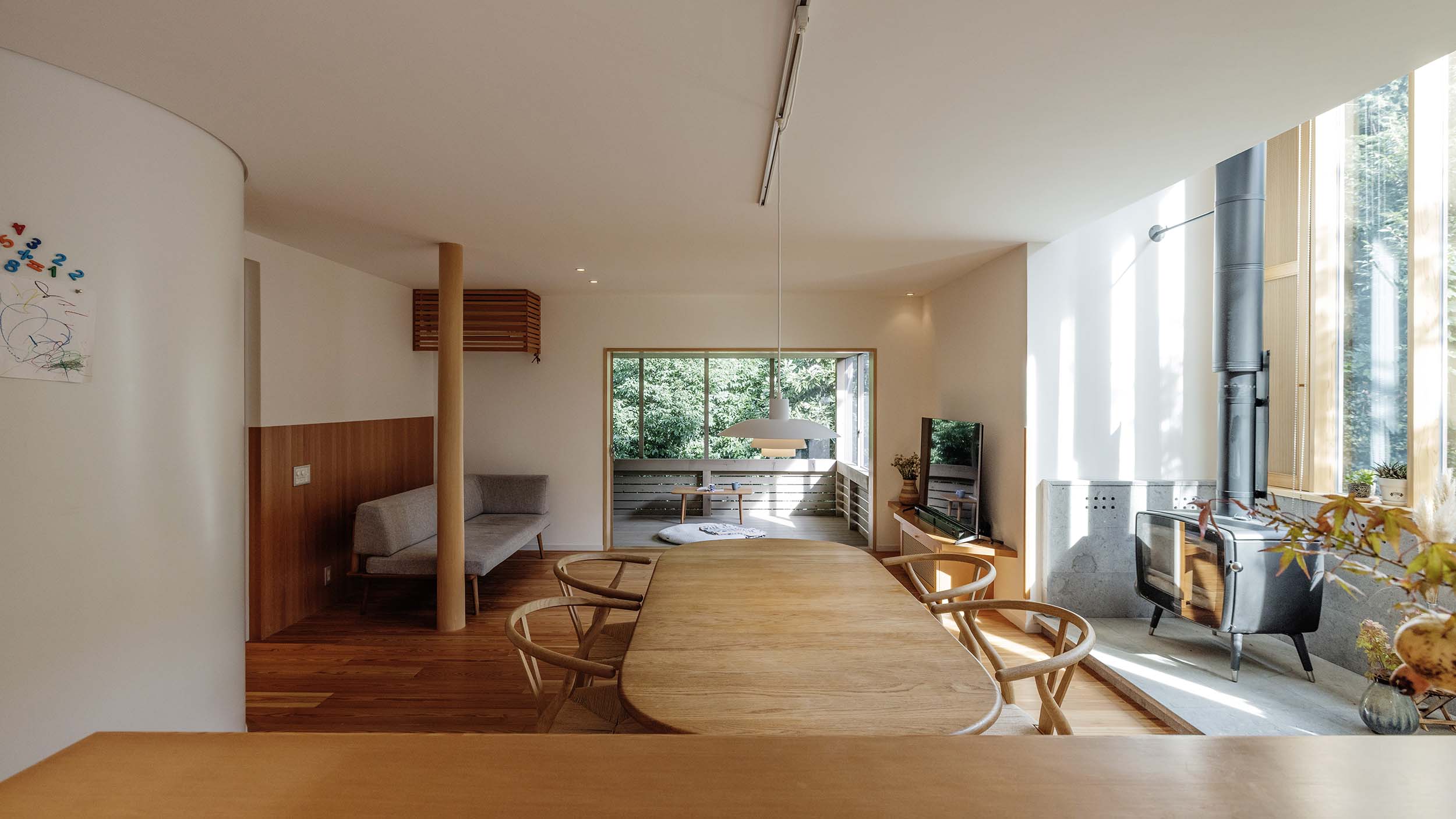 アウトドアなど多趣味なお客様のために、たくさんの収納と緑に開いたプランをご提案しました。 冬は薪ストーブの暖かさが、吹き抜けを通り家中暖かく過ごせます。 またテラスを網戸で囲むことでセカンドリビングダイニングとして森の中で朝食やBBQができ、住まう楽しさが無限大に広がるお家となりました。